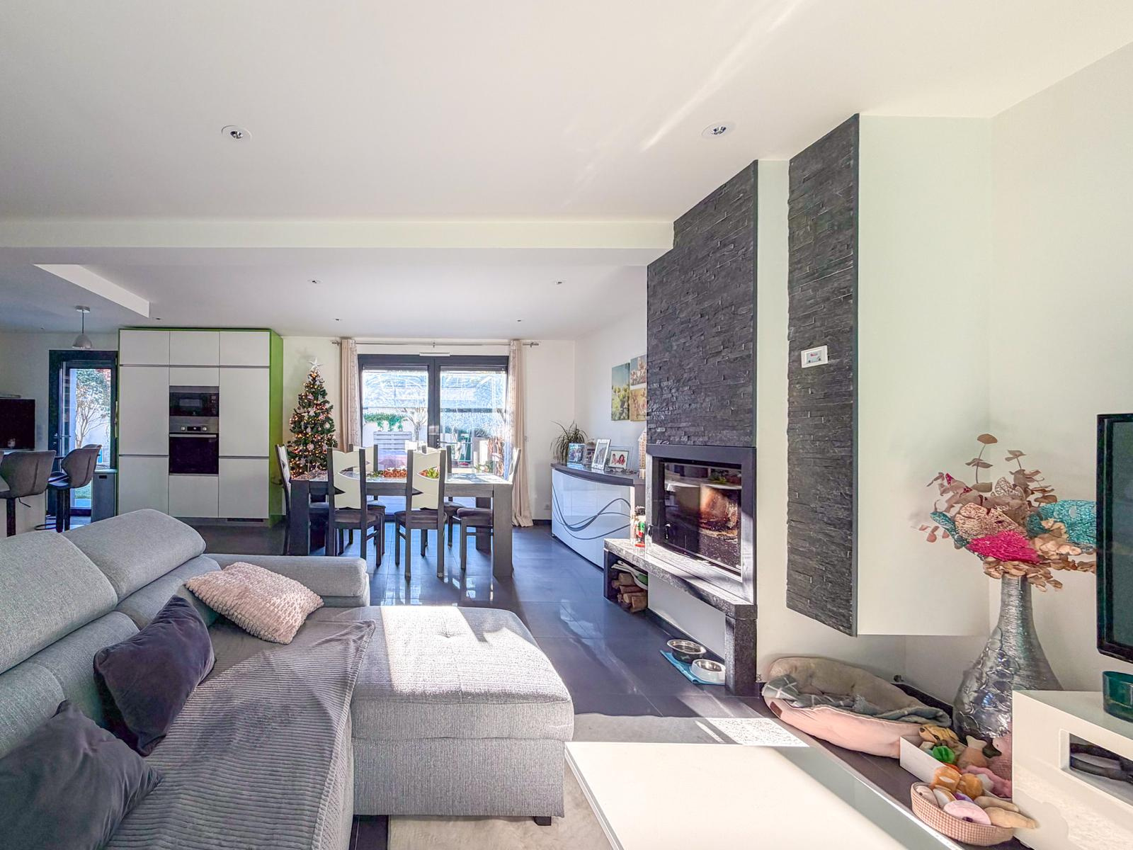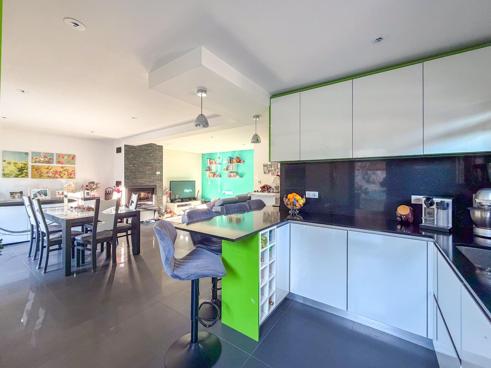 Il se compose d’une vaste pièce de vie de 48 m² avec cuisine US entièrement équipée, ouverte sur le séjour avec cheminée, offrant un accès direct à une terrasse sans vis-à-vis et au jardin.