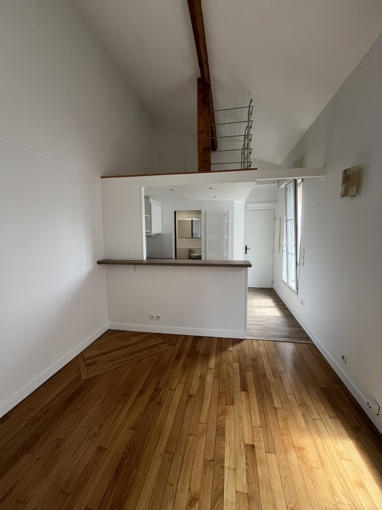 Séjour parqueté avec cuisine équipée et mezzanine, chambre parquetée avec dressing, salle d'eau avec Wc.