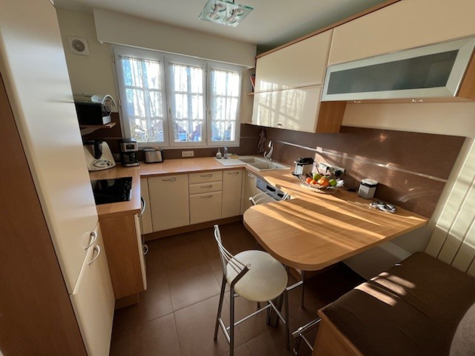 Au RDC : Séjour traversant de 35m² avec balocn, terrasse et accès jardin, Cuisine équipée Schmidt, chambre, salle d'eau, WC séparé